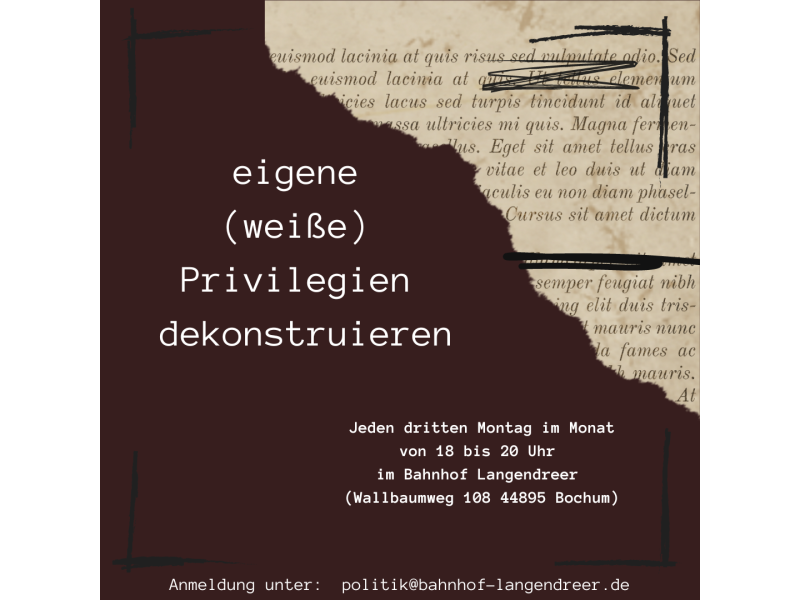 Jeden dritten Montag im Monat treffen wir uns von 18 bis 20 Uhr, um die Eingebundenheit der eigenen Persönlichkeit in rassistische Denk- und Gefühlsmuster zu erkennen, Mechanismen des Rassismus auch auf struktureller Ebene zu entdecken und Wege zu seiner Verringerung zu finden.