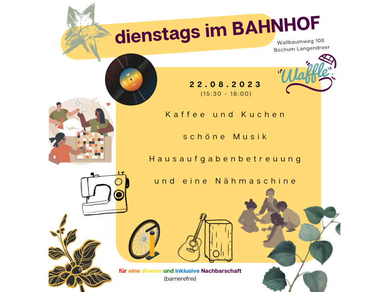 Wir laden euch herzlich zu unserem 17. Treffen von "dienstags im BAHNHOF" (22.08.23, 15.30 Uhr bis 18 Uhr) ein, wo wir in einer lockeren Atmosphäre die Gelegenheit haben, uns kennenzulernen und auszutauschen.
