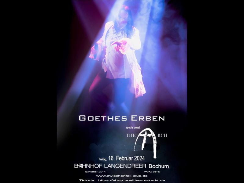 Goethes Erben begeben sich auch 2024 auf eine kurze, dreitägige Konzertreise. Mit 10 Studioalben im Gepäck und verstärkt durch Benni Cellini am Cello begeben sich Goethes Erben auf eine musikalische Zeitreise, die ganz bewusst nicht ein "Best of", sondern ein "wichtig war und ist" sein wird. Man darf gespannt sein, wie Oswald Henke diese Dramaturgie festlegt und umsetzen wird. Musikalisch haben sich Goethes Erben noch nie festlegen lassen, zwischen lärmendem Metall und filigranen Streicherklängen ist alles möglich und viele Worte und Inhalte haben auch nach Jahrzehnten nichts von ihrer Wucht verloren.