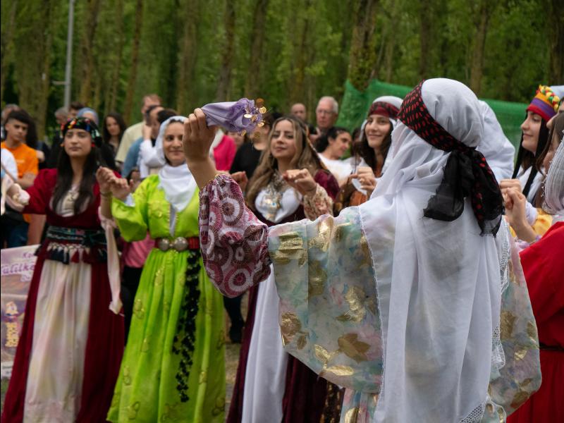 Ilhan Akyol erklärt dem Publikum die kulturellen und politischen Hintergründe verschiedenen Tanzformen aus Mezopotamien. Die Frau:en von Koma Kulîlkên Welat zeigen Anfänger:innen, wie die Grundschritte der Kreistänze funktionieren. Auch Fortgeschrittene können ihre Tanz-Skills erweitern.