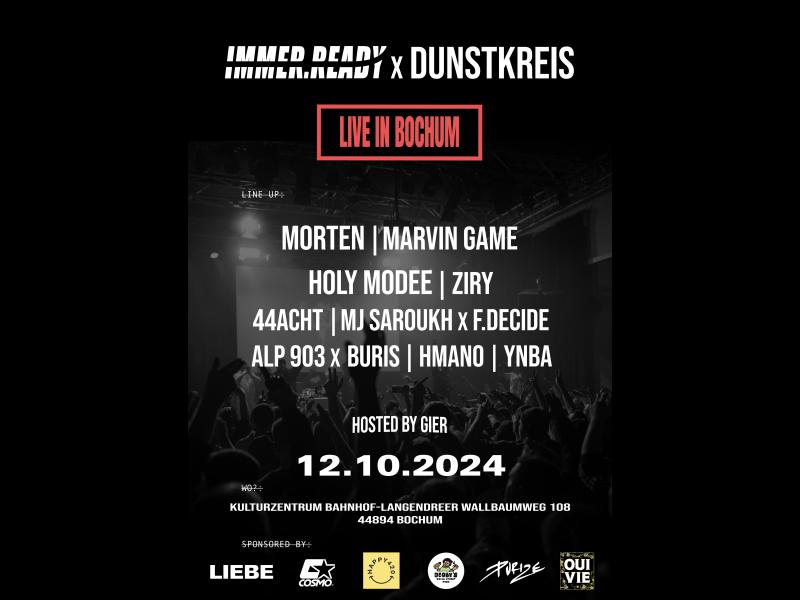 Erstmals treffen die Kollektive IMMER.READY und der "dunstkreis." aus dem Ruhrgebiet für ein exklusives Konzert in Bochum aufeinander. Moderiert wird der Abend von keinem geringeren als Gier. Nach dem Konzert findet in der Location auch die Aftershow-Party mit Live-DJs und weiteren special acts statt. Sichere dir jetzt ein Early Bird-Ticket zum Vorteilspreis oder gönn dir ein VIP-Ticket und freu dich über viele specials unserer Sponsoren.