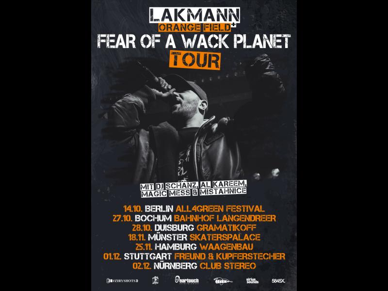Am 13.10.17 erscheint Lakmanns neuestes Werk "Fear of a wack Planet" bei Eartouch Ent. Das Produzenten Team Orange Field hat sich ausschließlich um die Beats gekümmert und man findet keine Features auf dem Album. Lakmann pur auf dopen Beats! Zu dem Album wird es kleine Tour mit einer Releaseparty und 6 exklusiven Auftritten geben.