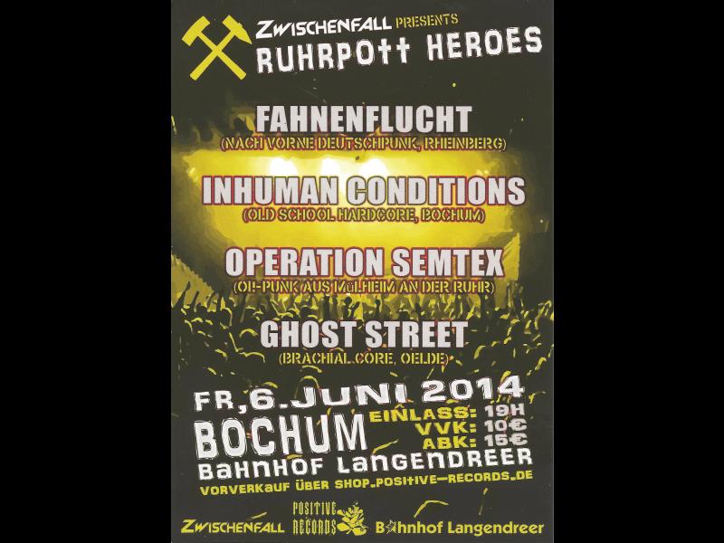 Aus der alljährlich stattfindenden Event Reihe „Local Heroes“ wird „Ruhrpott Heroes“ und erweitert damit den Horizont über die Grenzen Bochums hinaus. Es werden nun nicht nur unbekannten Bochumer Bands eine Auftritts Chance ermöglicht und damit die lokale Kulturszene gefördert sondern mit dem neuen Konzept möchte man den gesamten Umkreis des Ruhrgebiets befeuern. Darüber hinaus sind dieses Mal auch hochkarätige Bands als Zugpferde dabei wie die Rheinberger Punk Formation FAHNENFLUCHT sowie die Bochumer Hardcore Legende INHUMAN CONDITIONS. Ebenfalls mit dabei sind OPERATION SEMTEX sowie GHOST STREET.